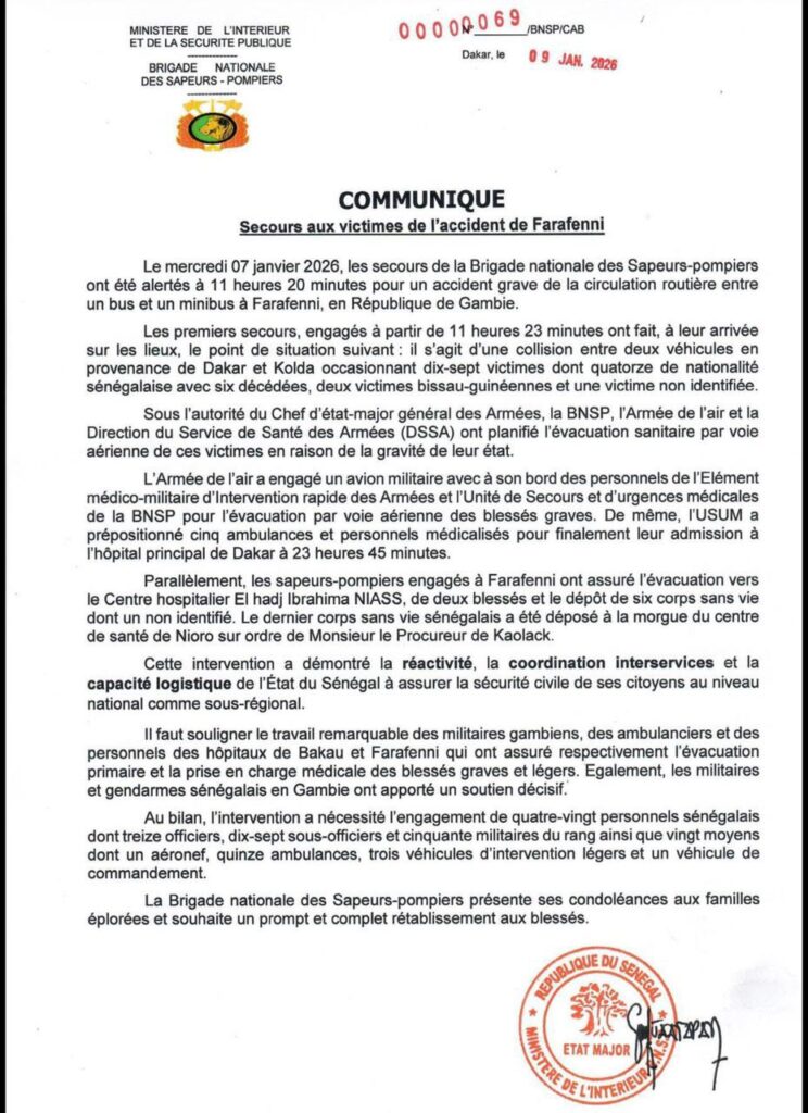 Communiqué de la Brigade Nationale des Sapeurs Pompiers sur l’accident de Farafenni.